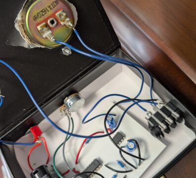 This is based on Chuck Johnson’s adaptation of a design from Nic Collins’ book “Handmade Electronic Music” for the realization of “Vespers” by Alvin Lucier. The circuit is built on paper inside of a small box.