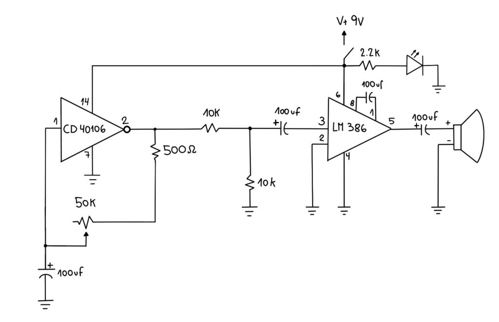 For the output I connected a ¼ inch jack with a switch to be able to use the small speaker built into the box, or connect a different kind of speaker. I use this feature to be able to play with the spatialization of the clicking sounds.