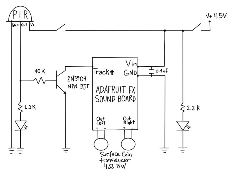 This piece may look like a hybrid between visual arts, electronics, and sound but its genesis is purely musical. The first prototype was the answer to a situation where a concert had to happen without a concert hall and without performers. To solve this problem, I designed a device that would only make sound in the proximity of a person. My concept was that the circuit would be complete—and the concert would unfold—through the presence of an audience member. .